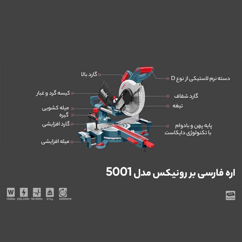 ویژگی های تیغهمناسب برای برش چوبویژگی های ارهحفاظ قابلیت برش با زاویه قابلیت فارسی بر قفل سوییچ کیسه برادهظرفیت برش در چوب150 میلیمترسرعت حرکت آزاد4500توان1500 واتمنبع تغذیهبرقابعاد79x52x52 سانتیمتر
