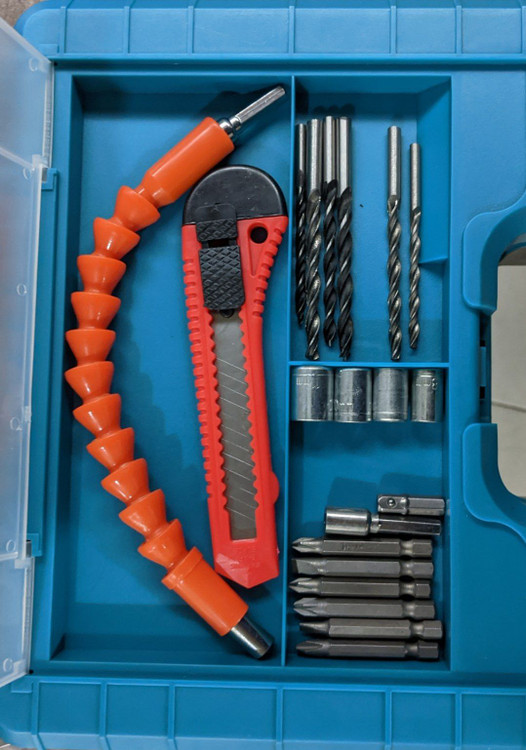 دارای 6 عدد مته - 6 عدد بیت پیچگوشتی -4 عدد سری بکس-رابط 20 سانتی -رابط بکس -کاتر -شارژر -باطری یدک