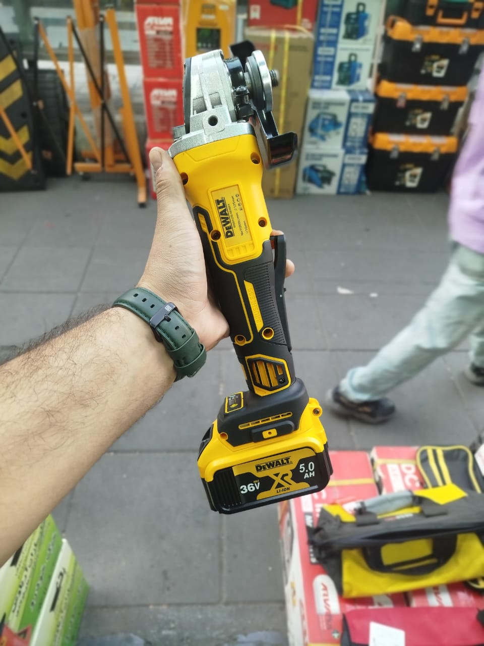 مینی فرز شارژی طرح دیوالت دارای 2 عدد باطری گارد محافظ دسته نگهدارنده پایه شارژر جعبه bmcمقاوم قابل حمل موتور براشلس دارای تنظیم سه سرعته شاسی ضامن دار جهت حفاظت و ایمنی