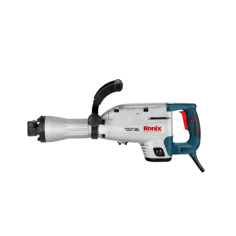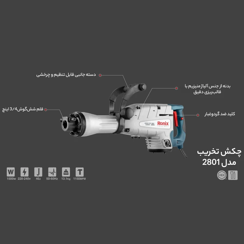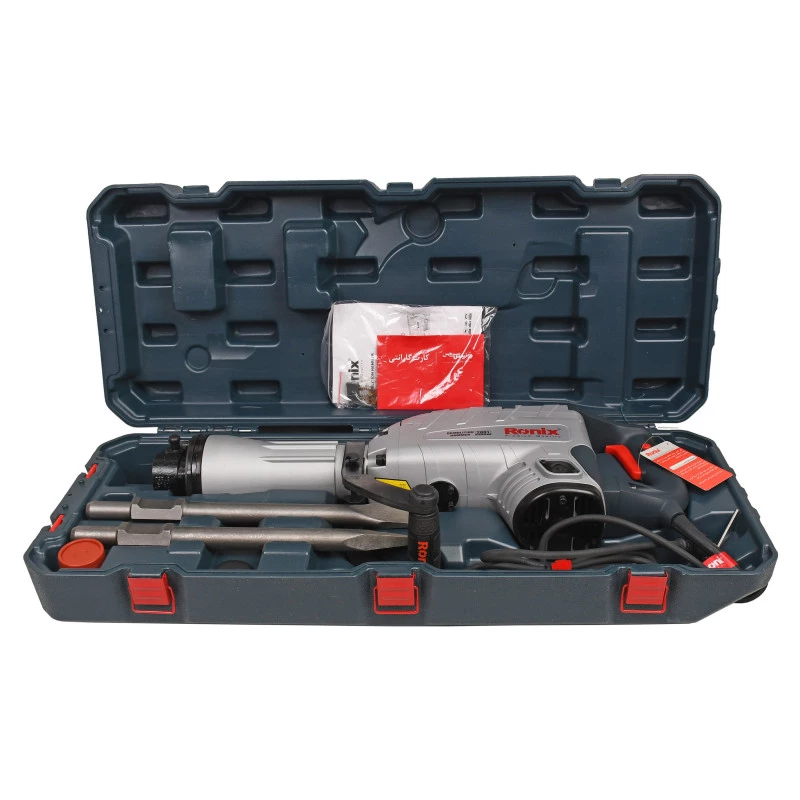 محصول پیش روی شما چکش تخریب 14 کیلوی رونیکس میباشد. این چکش تخریب با کیفیت بسیار مطلوب و تحت استانداردهای روز دنیا تحت عنوان مدل 2814L به بازار عرضه شده است. منبع تغذیه این ابزار برق بوده و ولتاژ آن بین 220 تا 240 ولت است. وزن این دستگاه 14 کیلوگرم و توان آن 1600 وات است. قدرت موتور بالا و وزن سنگین این محصول باعث شده است تا در دسته ابزار آلات صنعتی قرار بگیرد و مصرف آن برای انواع پروژههای صنعتی مناسب باشد. قدرت بسیار زیاد موتور این محصول باعث شده است تا چکش دارای قدرت بسیار زیادی جهت تخریب داشته باشد، توان ضربه این چکش 45 ژول است. این چکش تخریب که با سیستم روغنی طراحی گردیده است به کمک آچارهای همراه آن به سادگی توسط کاربر قابل سرویس کاریست که شامل روغنکاری دوره ای و تعویض ذغال میباشد. در این پیکور برقی رونیکس از بلبرینگهای ضد غبار و اورینگ و پکینگهای مقاوم در برابر حرارت جهت بالا بردن عمر دستگاه استفاده کرده است. 2814L مجهز به سنبههای میانی، ضربه زن، شاتون و سیلندر ساخته شده از بهترین آلیاژ و مواد اولیه است که نتیجتا دوام و عمر دستگاه را بالا خواهد برد