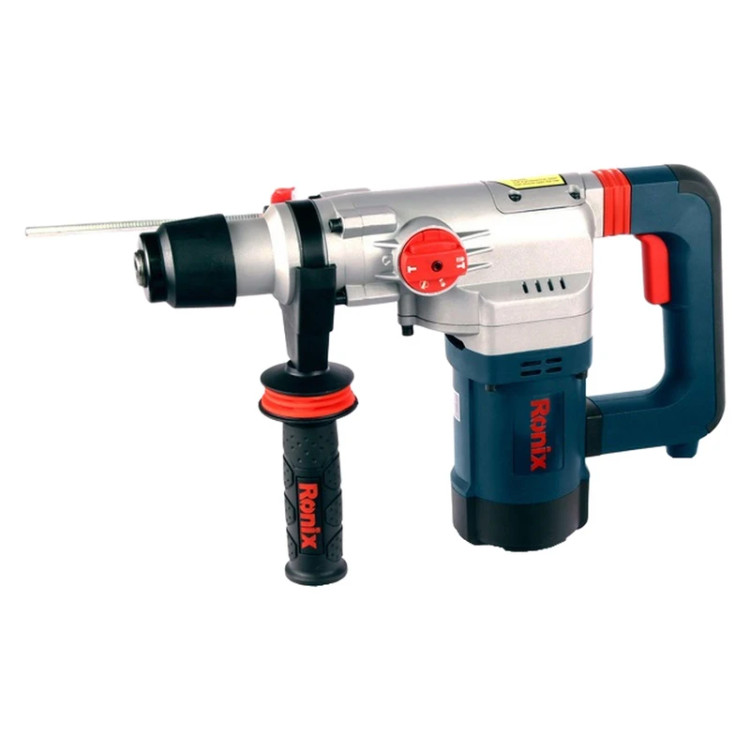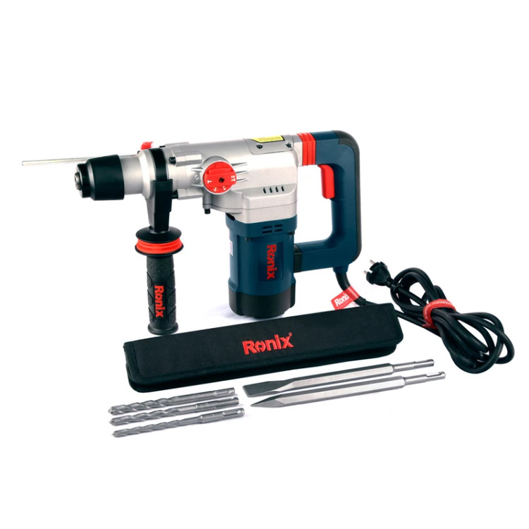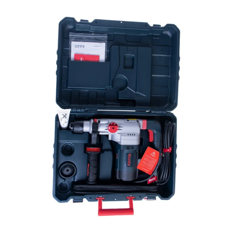 ظرف گریس، محافظ لاستیکی ابزارگیر، میله تنظیم عمق، دسته جانبی طراحی شده توسط رونیکس و کیف حامل متهها شامل: یک مته SDS-PLUS 8x150 یک مته SDS-PLUS 10x150 یک مته SDS-PLUS 12x150 یک مته نوک تیز SDS-PLUS 14x250 یک مته نوک تخت SDS-PLUS 14x250