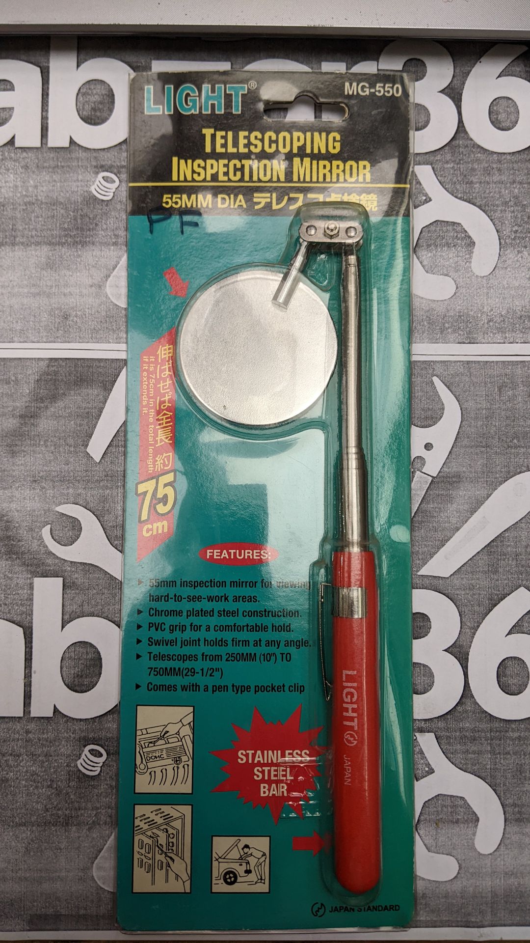 ابزارهای با کیفیت برند Light ساخت کشور ژاپن آینه بازرسی به شکل دایره ای با قطر 55 میلی متر دارای قاب از جنس فلز با پوشش کروم مجهز به روکش دسته از جنس PVC امکان افزایش طول از 250 تا 750 میلی متر (10 تا 24 اینچ) ساخته شده از آلیاژ استنلس استیل ضد زنگ ضمانت اصالت و سلامت فیزیکی کالا