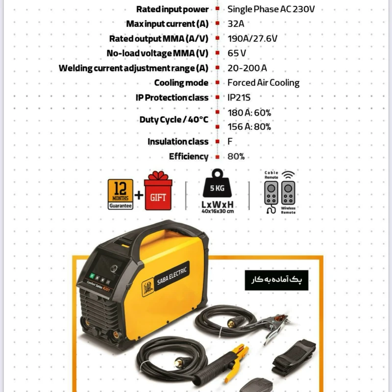 دارای دستیار هوشمند جوشکاری: قابلیت تنظیم هوشمند جریان خروجی دستگاه براساس قطر الکترود و ضخامت ورق را دارا است خروجی 200 آمپر واقعی است از تکنولوژی به روز اینورتر با استفاده از المان قدرت IGBT استفاده شده است ابعاد، حجم و وزن کاملاً مناسب (پرتابل) است صفحه نمایش LCD پیشرفته و بزرگ دارد امکان جوشکاری در حالت DC TIG و MMA دارد قابلیت کار با ریموت کنترل کابلی و وایرلس دارد قابلیت تنظیم ARC FORCE دارد قابلیت تنظیم HOT START دارد قابلیت VRD دارد دارای پک آغاز به کار شامل (کابل و انبر جوشکاری /ریموت وایرلس) است